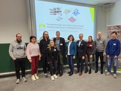 Nach Impulsvorträgen von Prof. Angelika Mettke (BTU Cottbus-Senftenberg), Anna-Lena Schürmann (RUB) und Vertretenden der Fachvereinigung Deutscher Betonfertigteilbau e.V. (FDB) diskutierten die Teilnehmenden in Arbeitsgruppen die Themen „Bauteilkasten“ sowie „Prozesse von Fertigung und Logistik“. Die Ergebnisse wurden anschließend im Plenum zusammengeführt.